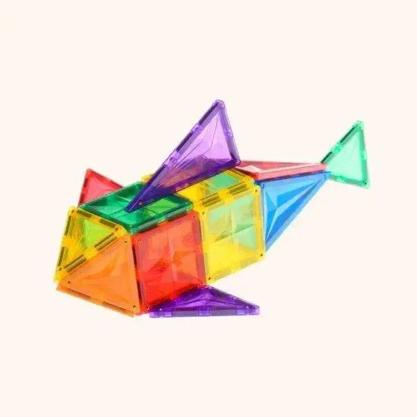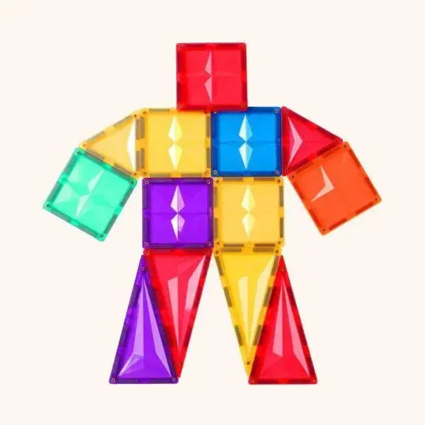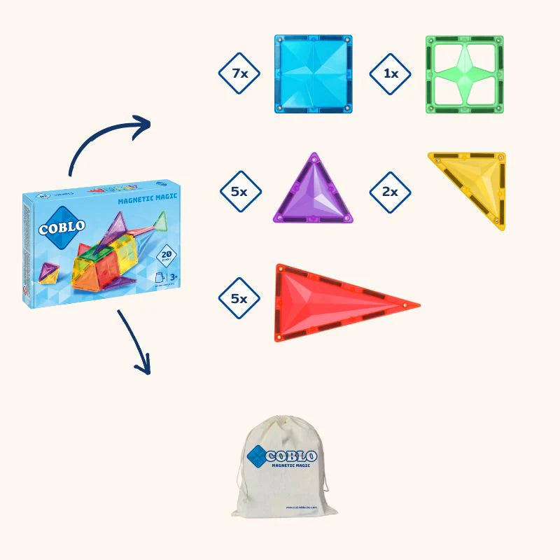 Set van 20 magnetische tegels in de kleurencombinatie ‘classic’, bestaande uit verschillende vormen. Het zijn platte, transparante tegels met magnetische randen, waar je de mooiste figuren en mandala’s mee kunt leggen, figuren maken of zelfs de hoogte in kan bouwen! Dankzij de magneetjes kunnen kinderen dit al snel zelf en hoe ouder het kind wordt, hoe rijker de creaties. Daarnaast zijn de magnetische tegels erg leuk te combineren met autootjes, poppetjes, knuffels en nog veel meer. Door middel van het bijgevoegde inspiratieboekje worden de kinderen geprikkeld om nieuwe creaties uit te proberen. Daarnaast bevat dit pakket ook een opbergzak om de magnetische tegels makkelijk en netjes op te kunnen ruimen.
