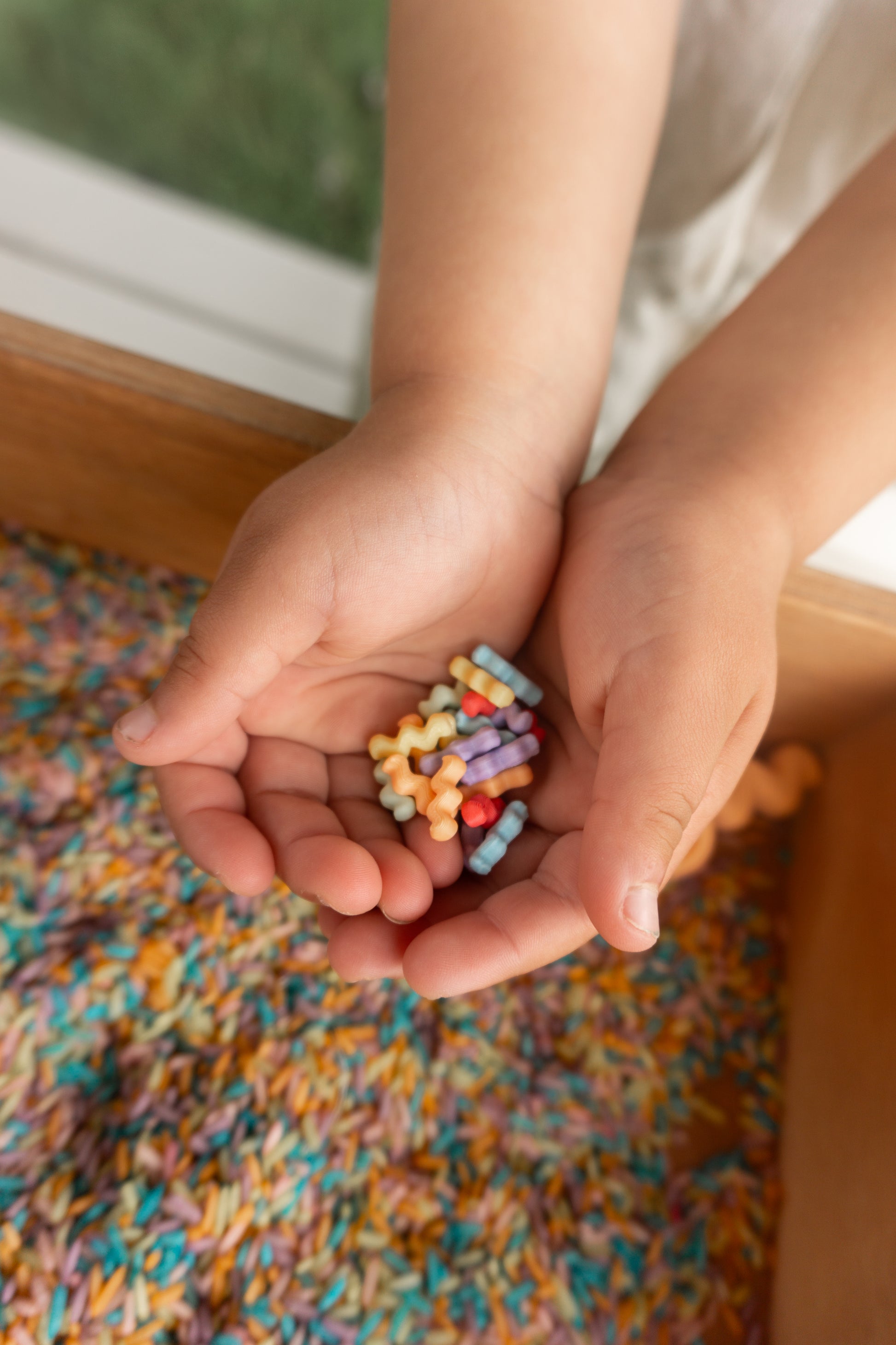 Kinderen zullen het spelen met sensomotorische gekleurde speelrijst geweldig vinden. Het is het ideale speelgoed voor kinderen om te ontdekken. Spelen met speelrijst helpt prikkels te verwerken en te ontspannen.
