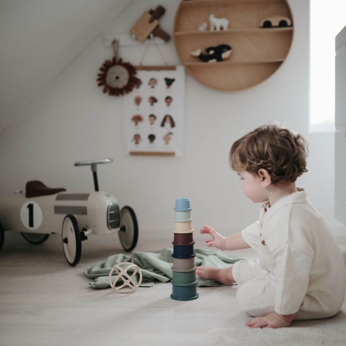 Een perfect kraamcadeau dat meegroeit met de ontwikkeling van je kind: eerst oefent je kindje met het pakken van de bakjes en fascineert zich over het wegrollen ervan. Later kan het ermee stapelen, de bakjes in elkaar passen of ermee scheppen in bad. De bakjes verschillen van elkaar qua bodem: dicht, of met verschillende vormen en openingen. Dat maakt ze ook leuk om mee te nemen naar het strand of de zandbak! Een zeer veelzijdig product en een lust voor het oog.