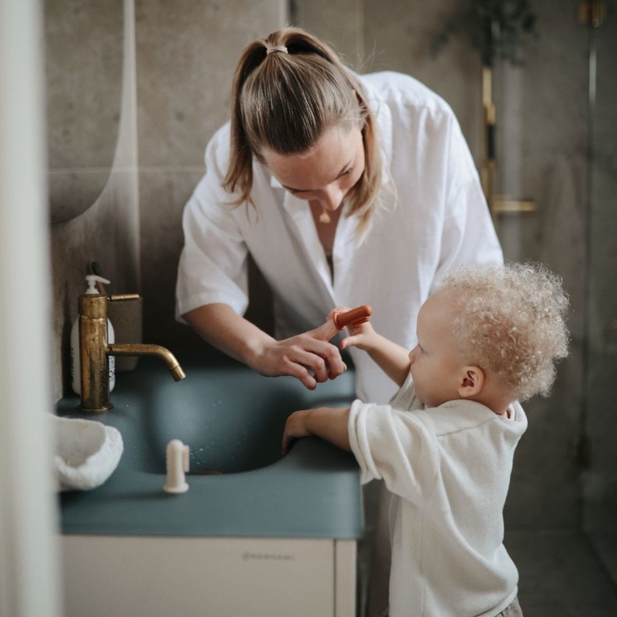De fijne structuur aan de voorkant reinigt de eerste tandjes en het tandvlees, terwijl de zachte bobbeltjes aan de achterkant helpen om geïrriteerd tandvlees te masseren en kalmeren. Zo maak je van poetsen een liefdevol verzorgmoment samen en bouw je een gezonde mondverzorgingsroutine op.